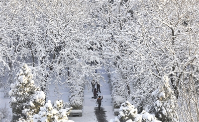 昨日,景山公园的树木积满了雪,形成美丽的树挂。