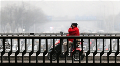 1月31日,光明桥,一男子骑车通过二环,当日京城雾霾持续。 新京报记者 尹亚飞 摄