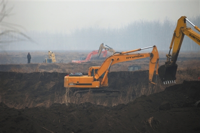 ◀昨日,顺义区南彩镇,工作人员操作挖掘机平整土地,为平原造林工程做准备。新京报记者 薛珺 摄