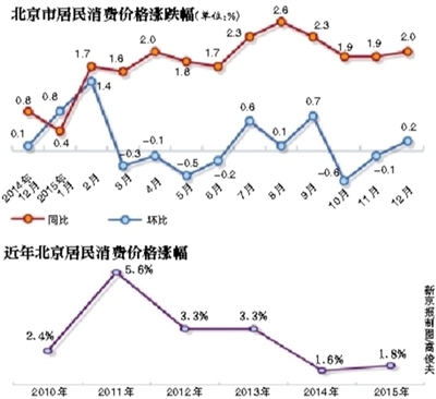 新京报讯 (记者沙璐)昨日,北京市统计局、国家统计局北京调查总队发布数据,2015年12月份,北京市居民消费价格总水平同比上涨2.0%,环比上涨0.2%。2015年北京市居民消费价格总水平比上年上涨1.8%。