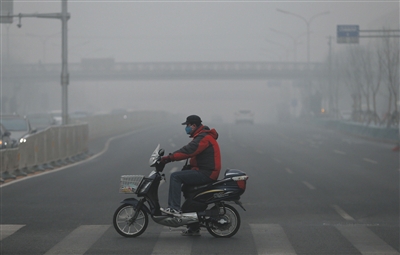12月25日,菜市口大街,一位市民戴着口罩过马路。当天京津冀多地空气重污染。昨日发布的《京津冀协同发展生态环境保护规划》明确,到2020年,京津冀地区PM2.5年均浓度要比2013年下降40%左右。新京报记者 薛珺 摄