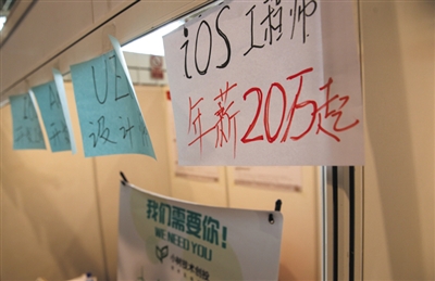 一个展台上贴出“ios工程师年薪20万起”的宣传语。IT技术类也是招聘会最热门岗位之一。