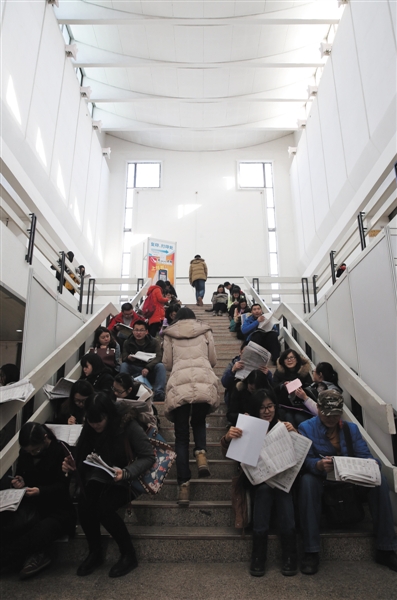 昨日,中国国际展览中心老馆2号馆的楼梯上坐满了应聘者。当天,年内最大规模研究生招聘会在此举办。