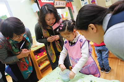 11月17日,丰台第二幼儿园办学实践研讨会专家入园指导活动举行。丰台二幼28年的办学实践过程中逐渐形成了完善的“至乐教育”,创建了“关注生命,立足生长,源于生活,富有生趣”的园本课程,以此为载体培养幼儿健全的心智、良好的学习品质和积极的生活方式。新京报记者 杜丁 摄影报道