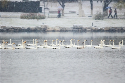 昨日,上百只天鹅伴随雪花,飞临延庆夏都公园,吸引大量市民围观。它们成群结队,或游弋在湖水中央,或翱翔于飞雪半空,成为冬日延庆一道亮丽的风景。