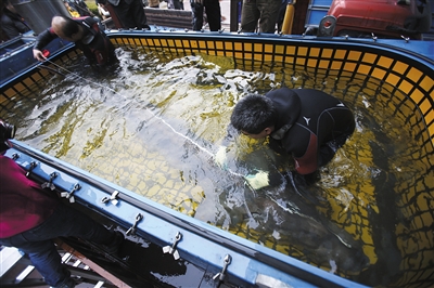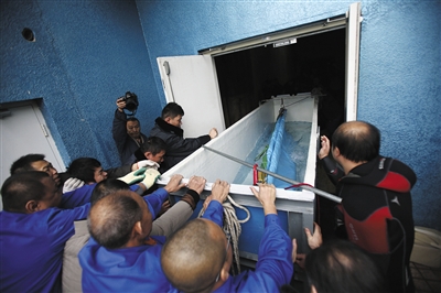 昨日,北京海洋馆,工作人员在搬运野生中华鲟“后福”进馆。