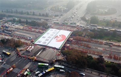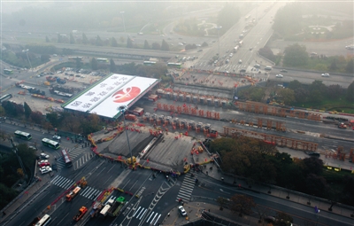 昨日11时,三元桥新桥梁实现精准就位。至18时,经过连续43小时的紧张施工,三元桥桥梁整体置换工作完成。三元桥大修工程13日启动,采用桥梁整体置换工法,移走旧桥的整体结构,快速将新桥梁架设到最终位置。在大城市重要交通节点上一次性完成大型桥梁的整体置换架设,在国内属首次。新京报记者 王贵彬 摄
