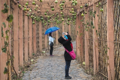 11月5日,延庆县慈母川村,游客在挂满葫芦的长廊拍照留念。新京报记者 周岗峰 摄