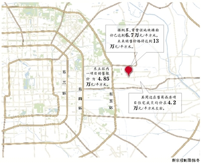 新京报讯 (记者李捷)北京土地市场战火重燃。昨日,保利首开联合体出价33亿,拿下位于北京朝阳区常营乡一地块。据业内测算,该地块楼面价已达到6.7万元/平方米,创下了北京土地楼面价的第三高。
