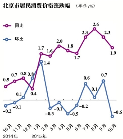 新京报讯 (记者沙璐)2015年10月份,北京市居民消费价格总水平(CPI)同比上涨1.9%,小幅回落,在连续三个月超过2%后,再次回到“1”时代。1-10月,北京市居民消费价格总水平比去年同期上涨1.8%。