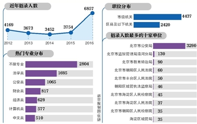 公告显示,2016年“京考”共设1956个职位,计划招录6857人,规模达历年之最,与2015年上下半年合计招录5856人相比,还增加了千人。