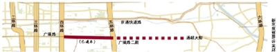 从地图上看,这条贯穿东西城区的两广路东延道路,却在东五环“断头”;通州区内的通朝大街几乎与之平行,中间却有近7公里的隔断,这正是预计在明年十一开通的广渠路二期。