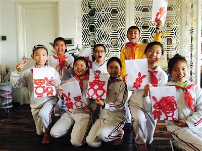 一把剪刀,几张红纸,七剪八剜,展开来居然是活灵活现的金鱼、小熊、兔子……剪纸的魅力让孩子们兴奋不已。日前,崇文小学五年级4班的小学生来到崇文茶画汇,参加家委会为孩子们策划组织的传统文化进校园系列之“学剪纸”活动,河北省民间工艺美术大师巩春华带孩子们走进剪纸的世界。新京报记者 杜丁