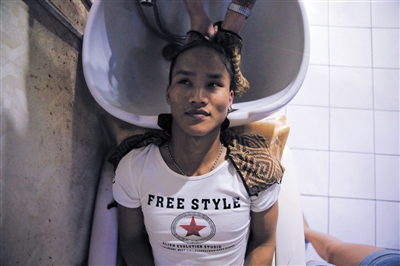 8月5日,来自云南的岩平在南小街的理发店准备染发。他和女友在服装厂工作了两年。除了每月1号的假期,岩平平日的生活都没离开南小街。
