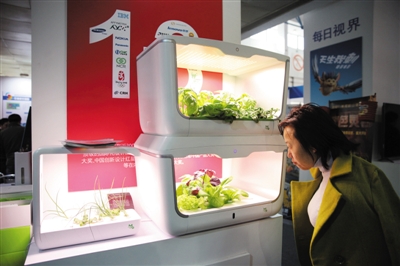 国展中心,一观众欣赏智能果蔬种植设备“巴比立方”。新京报记者 薛珺 摄