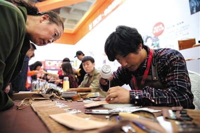 国展中心,一位观众欣赏皮雕艺术家现场制作。
