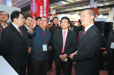 昨日,北京文博会展馆,国家新闻出版广电总局局长蔡赴朝、副局长田进、北京市委常委、宣传部部长李伟、北京市副市长王宁等视察大燕网展厅。工作人员介绍大燕网情况。 大燕网 陈洁 摄