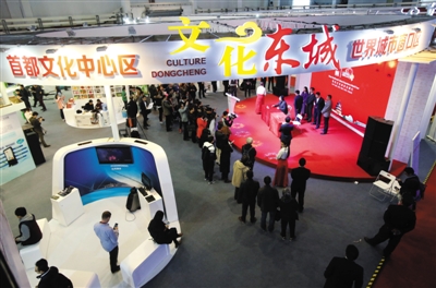 东城主展示区分为五个区域:“文化东城”展示区、“文化+”体验区、历史文化传承区、商务合作洽谈区、舞台推介区。传统的老北京文化展示区,有不少非遗传承人现场制作传统的手工艺品。东城展区融合了传统和科技,不但有这些接地气的展示,还能看到最新流行的裸眼3D、最新手游、陆上划船器。