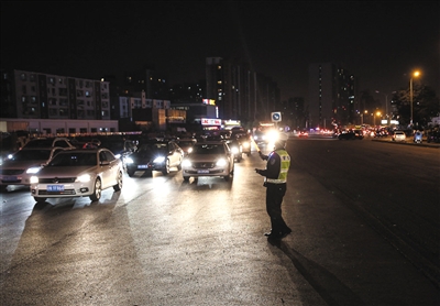 昨晚,一位交警在大悦城十字路口疏导交通。新京报记者 卢淑婵 摄