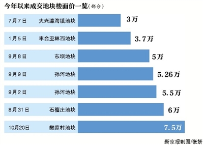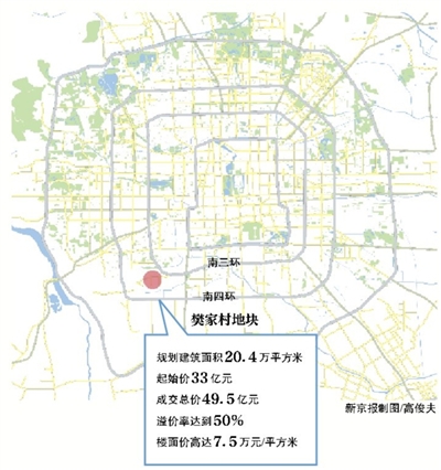 新京报讯 (记者李捷 陈禹铭 李颐晖)经历了短暂的平静后,北京土地市场再度沸腾。昨日,备受关注的丰台区花乡樊家村地块入市进行交易,在经历了73轮的激烈争夺后,最终由葛洲坝以总价49.5亿元,配建4.1万平方米保障房面积收入囊中。根据业内人士测算,该地块商品住宅部分的楼面价高达75000元/平方米,溢价率达50%,已经超越农展馆地块73000元/平方米的单价水平,楼面单价是今年以来新高,也创造了宅地历史纪录。
