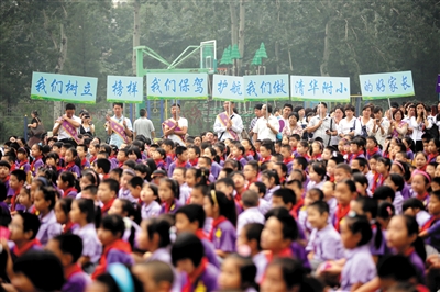 2014年9月1日,数十名家长志愿者参与小学开学典礼,正好赶上下雨,家长为学生撑起雨伞走廊。