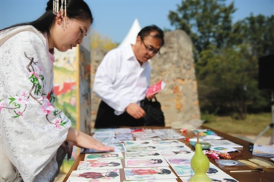 游身着汉服的年轻女性为游客介绍原创汉服明信片