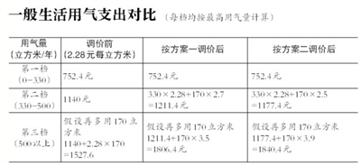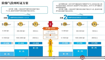 两套方案的区别在于分档气价,市发改委相关负责人介绍,方案一按照国家指导意见要求,各档气价比价关系为1:1.2:1.5,价格标准分别为2.28元/立方米(保持现行价格不变)、2.7元/立方米、3.5元/立方米。
