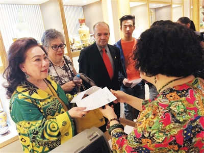 来自印度尼西亚的钟家燕是秀水街的老客户了,由于在北京多个高校担任客座教授,她经常来北京,闲暇时爱逛秀水街。今天上午,她领到了秀水街的第一张离境退税申请单。