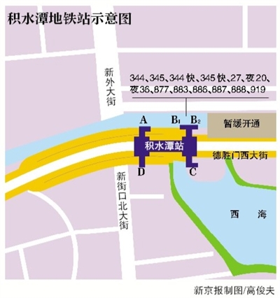 2号线积水潭站建于1984年,目前设有东南、西北、西南三个出口。该站地面公交与地铁换乘客流较大,目前主要通过积水潭站A口(西北口)进出,致使积水潭站西厅及西北口客流压力极大。地铁运营三分公司西直门站区副站长介绍,根据平时测算,积水潭站客流约11万,约七八万客流会从A口进出站,A口压力巨大。此外,乘客出站后还需要在二环辅路走一段,给地面也带来拥堵。