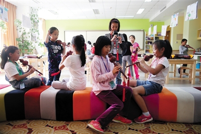 北京十一学校亦庄实验小学三年级小蚂蚁班的学生们正在上音乐课,教他们的则是包班的语文和数学老师。