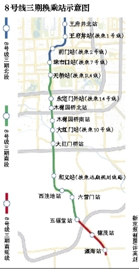最终地铁8号线三期及南延工程连通后,将与一期、二期形成全长近50公里、贯穿南北中轴线的大运量轨道交通,成为北京地铁线网中南北向骨干地铁线路,提高王府井、前门等大型商业中心轨道交通的服务水平,有望缓解南城地区的交通压力。