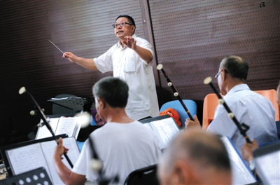 近日,石佛营南里社区,张根管正在指挥步步高民乐团排练曲目。新京报记者 薛珺 摄