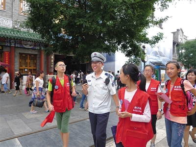 新京报小记者与城管工作人员一同走在前门大街巡逻执法。新京报小记者 张玉婷 摄