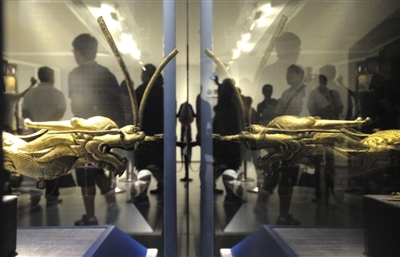 故宫博物院精品文物馆内,观众在参观清代宫廷金银器。昨日,故宫博物院精品文物馆在奥森公园瞭望塔开馆。首批展出以“金碧辉煌”为名的202件金银器,也是首次集中在公众面前亮相。未来5年内,故宫还将把院藏的家具、玉器、青铜器、瓷器等“外迁”至此,开办系列展览传播故宫文化。新京报记者 浦峰 摄