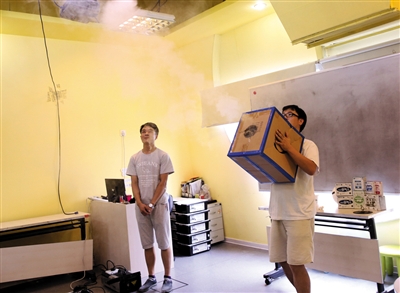 “看来是真有炮弹。那这炮弹长什么样呢?”老师此时往纸箱里充进了一种白雾样的气体,并关闭室内空调,然后将圆形孔洞对着观众,再次敲击纸箱,一个像烟圈一样的气体从纸箱中射出。