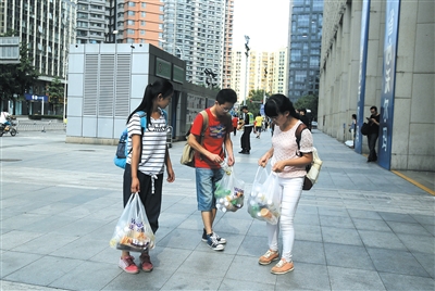 7月31日,殷亚东(中)和同伴从超市购买了40瓶饮料,准备作为礼物送给扫二维码的市民。每成功扫码一单,他们可从微商处拿到5元提成。