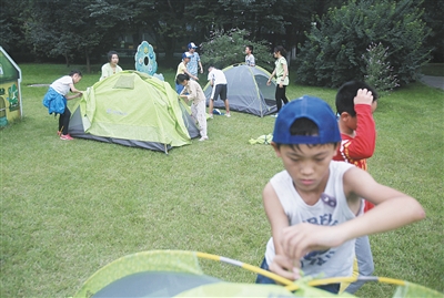 在露营搭帐篷环节,同学们逐渐意识到合作的重要性。本版采写/新京报记者 缪晨霞 摄影(除署名外)/实习生 彭子洋