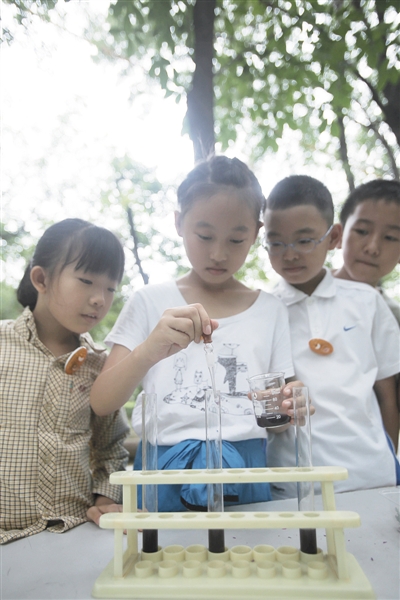 大树底下实验桌一溜排开,桌上摆放着试管、研钵等实验器材。孩子们在老师的带领下,从荷花、锦葵等植物的花瓣中提取出汁液,与两种不同的神秘物质混合,它们的颜色发生了变化。老师告诉同学们,神秘物质其实是日常生活中常见的物品——白醋和碱面,花瓣里的花青素遇到酸碱,就会发生颜色的改变。