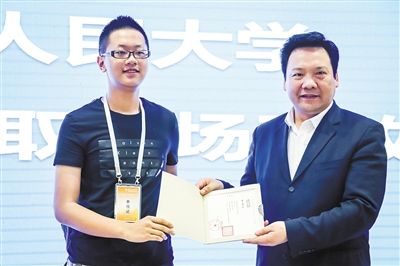 昨日下午,中国人民大学录取现场开放日,校长陈雨露向准新生发录取通知书。通讯员 冯其龙 摄