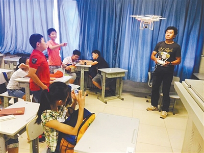 新京报首席摄影记者陈杰在摄影课上向学生们介绍无人机拍摄技巧。李鸽 摄