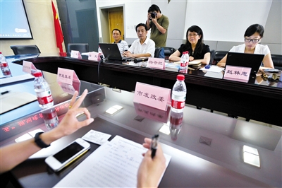 昨日,市十三五规划领导小组走进北京联合大学机电学院,现场对接该院青年教师王超(左一)关于垃圾分类的建议。新京报记者 王嘉宁 摄