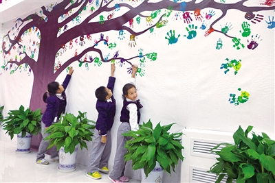 除了真实的树,树的意象在清华附小分校中也得到广泛应用。CBD分校与昌平分校都在教学楼大厅的进门处使用了树的意向:CBD分校用学生的笑脸拼成了一个大树的形状;昌平分校则制作了一幅“同源树”的画作,其中的树叶就是学校建校第一批师生的掌印,“这是一份珍贵的纪念。”刘建伟说。