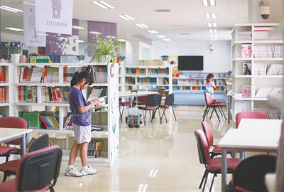 而CBD分校的图书馆,也是学生课后的临时托管地。放学后暂时没有家长接回的孩子,都会聚集到图书馆,一边看书一边等待家长。图书馆管理老师朱晓秋说,图书馆的氛围对于孩子有潜移默化的影响,面对满架的图书,学生一般都会选本书看,沉浸在阅读中,等待的时光也不会显得过分漫长。