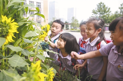 在CBD分校,邻近教学楼的窗下是一排班级“责任田”——每个班级可在属于班级的花池中种植花草或蔬菜,这边是挂在枝头的黄瓜、丝瓜,那边是结满瓜子的向日葵,还有隐藏在土地里的水萝卜……