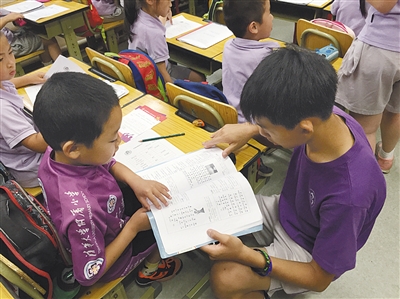六年级毕业生正在给低年级学弟辅导功课。