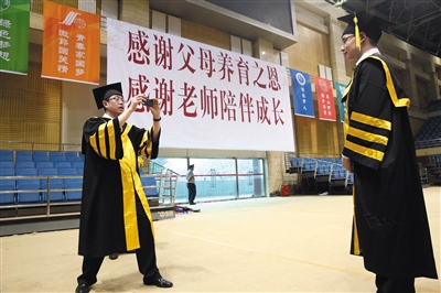 6月26日,中国人民大学毕业典礼上,一名毕业生正给同学拍照留影。 新京报记者 尹亚飞 摄