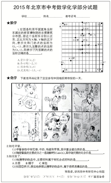 新京报讯 (记者黄颖 浦峰)昨日,2015北京中考进入第二天,考试科目为数学、化学。与以往满篇的数字不同,今年的两张理科卷子中,也出现了图片、连环画等,出人意料。