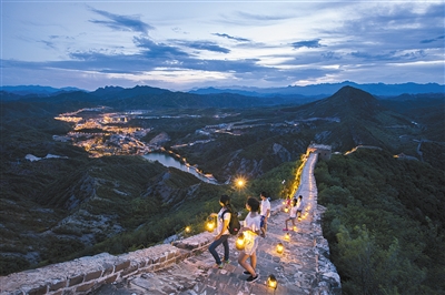 在今年6月19日,古北水镇隆重推出了夜游活动,丰富广大游客在景区的夜间游览。作为世界唯一一家开放夜游长城的司马台长城,在灯光亮起后如同一条金色的长龙盘卧在山峦之上,俯瞰着古北水镇的灯火人家。除了夜游长城,还开放了夜游船、夜市演艺、美食等内容,游客可以在晚上乘坐摇橹船欣赏两岸的灯影重重,穿梭在青石小巷,品尝特色小火锅、烤羊腿,感受边塞军事文化,再听上一曲传统北方大戏,如同参与一场日不落的庙会一般。