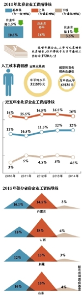 市人力社保局介绍,2015年企业工资指导线由三条线构成,分别为基准线、上线、下线。这三条线分别对应企业工资增长的一般、最高、最低幅度的指导意见。