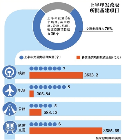 据新京报记者统计,截至6月10日,今年上半年发改委共批复34项基建项目,投资额超7200亿。其中交通类项目就有26个,约占基建投资项目的四分之三。今年以来,投资稳增长的重任落到了交通类基建投资领域。